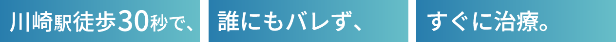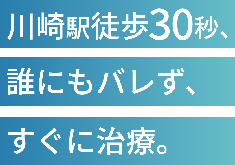 川崎駅地下街から徒歩30秒川崎駅地下街から徒歩30秒なので雨の日でも通院しやすく、365日年中無休で検査・治療を行っています。