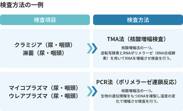 11項目クラミジア(性器・のど)、淋病(性器・のど)、マイコプラズマ(性器・のど)、ウレアプラズマ(性器・のど)、トリコモナス(性器)、梅毒2種(採血:TP定性・RPR定量)