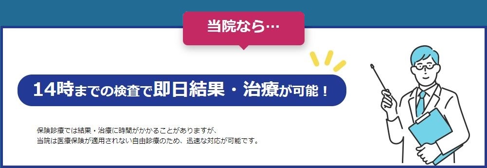 当院では年中無休で即日検査を行っているため、早期に治療が可能です。 -